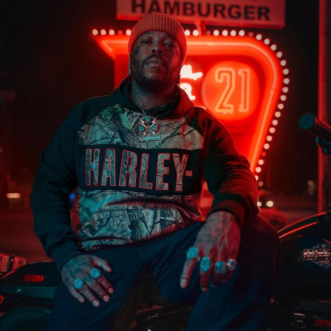 カラーブロックデザインには、ハードウッド、松林、草原、川底などのアウトドア環境を融合したRealtree APGパターンとハーレーダビッドソンのグラフィックが施されています。